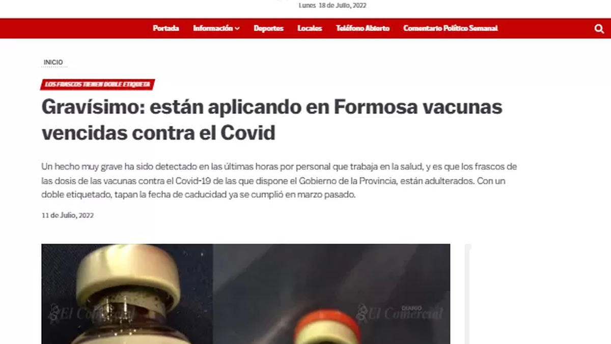 El 11 de junio pasado, el portal formoseño El Comercial publicó un artículo donde denunciaba el doble etiquetado de las vacunas contra el COVID-19 que se aplicaban en esa provincia.